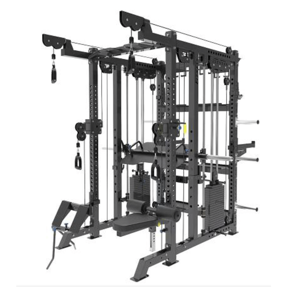 Accessories: 1. High-pull back 2. Low-pull back 3. Inverted pedal 4. Squat hook+safety 5. Olympic rod hanging hook 6. Barbell plate for gun barrel 7. Ground gun +V-shaped pull rod 8. Parallel bars product size: 2690*2235*2340 Tube: